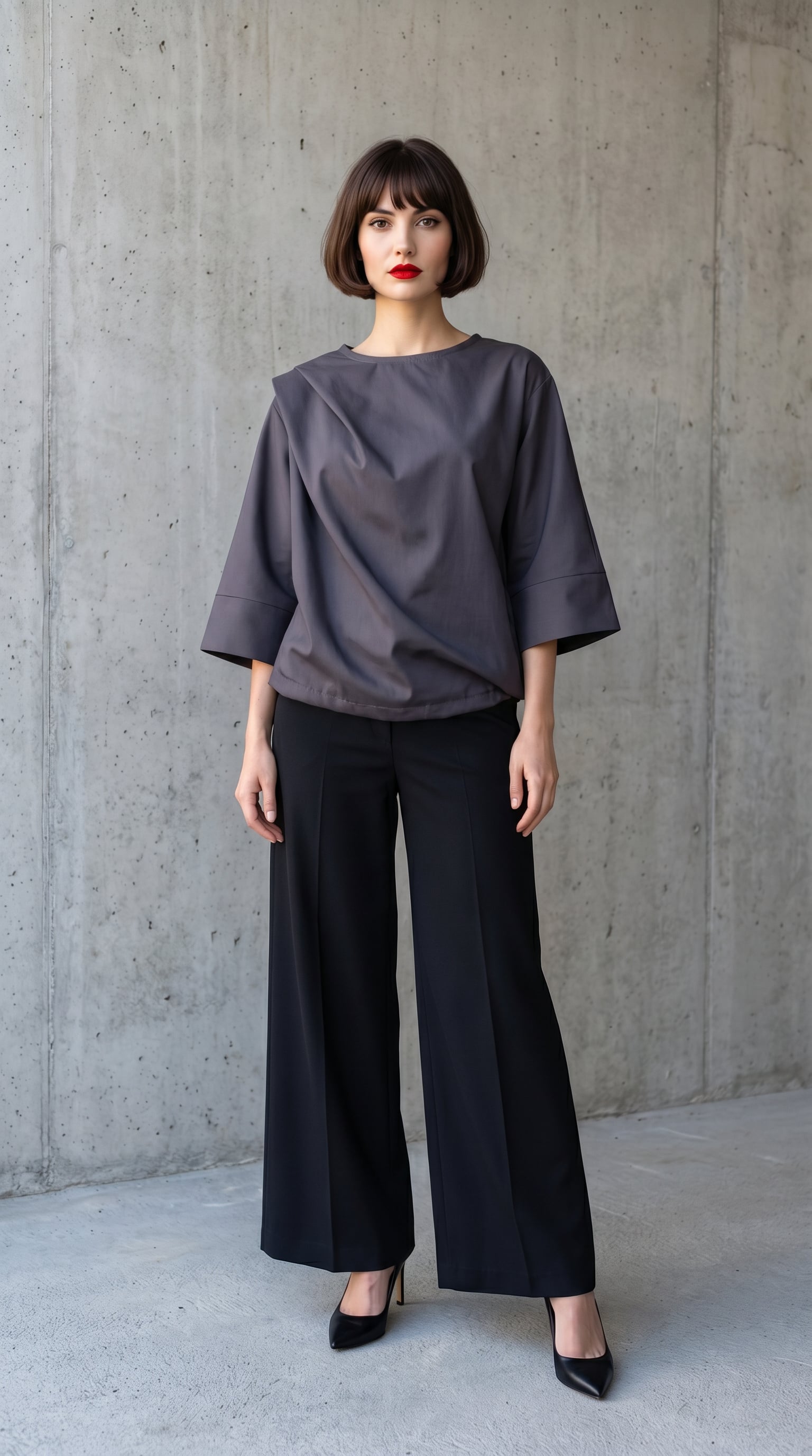Elegantna asimetrična tunika sa faldama na ramenu i vezicom u donjem rubu.