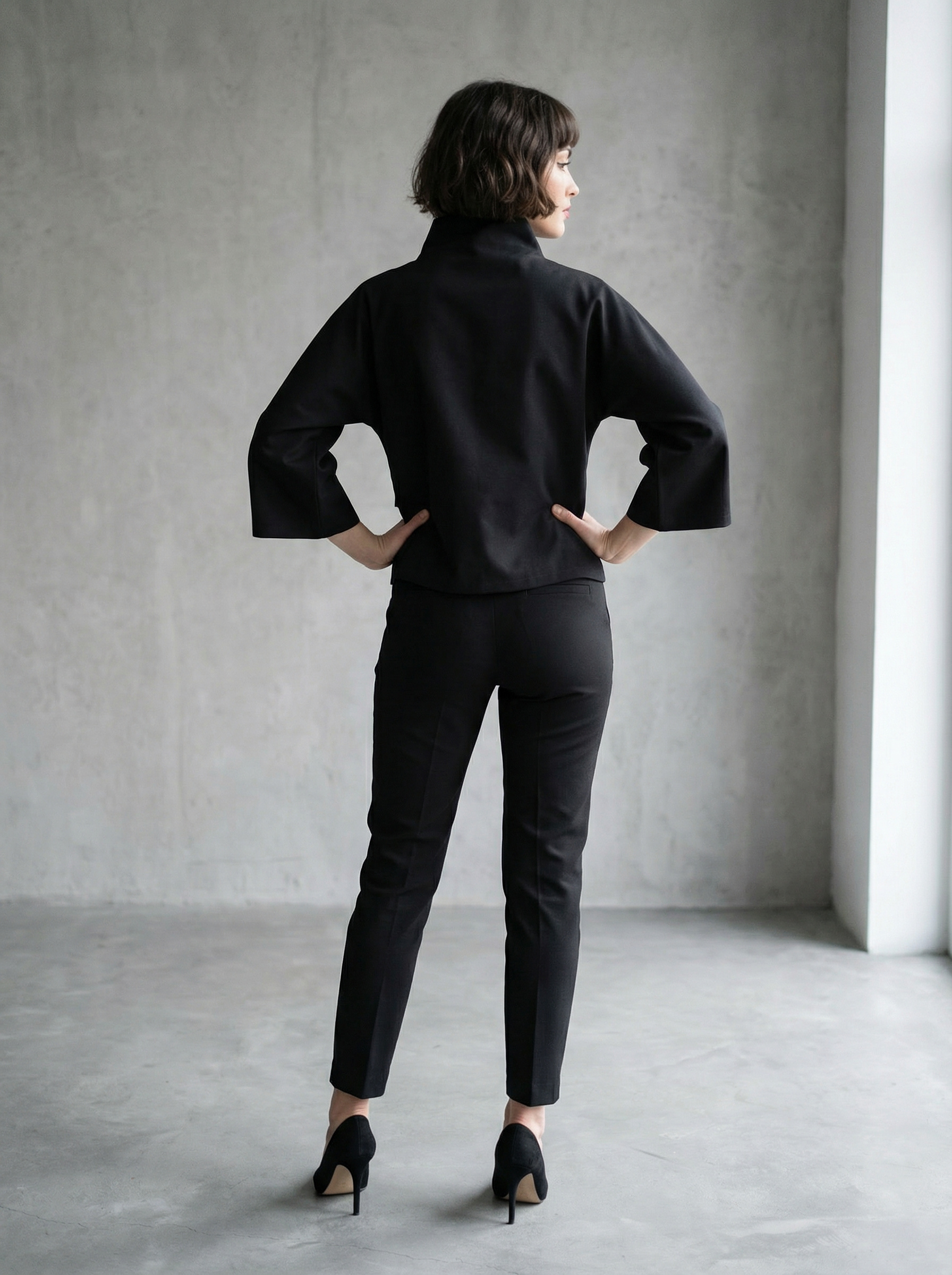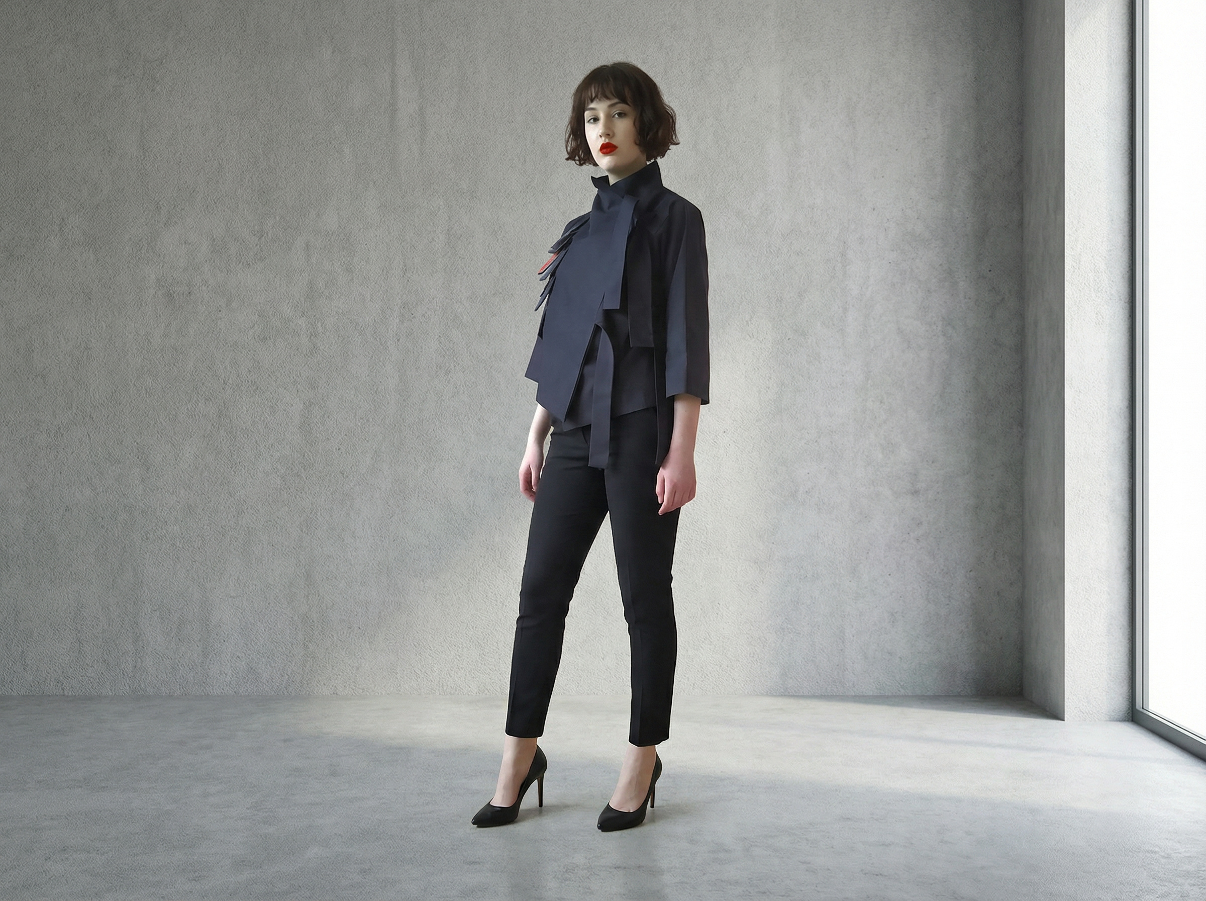 Kratka jaknica kimono kroja sa 3/4 rukavima. Prednjica se preklapa i veže se trakama asimetrićno na prednjici. Širina preklopa je 17 cm. Na prednjici su našiveni rukom oslikani pravokutnici i svaka jakna je unikat za sebe. Sastav tkanine je 100% pamuk i održava se pranjem u mašini na osjetljivom programu za vunu ili svilu. Dostupna je u dvije veličine M i L.
